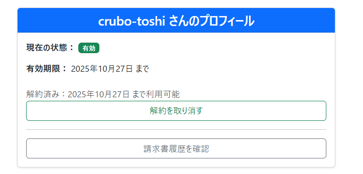 解約については『解約する』ボタンから解約することができ、次回以降の決済がキャンセルになります。
