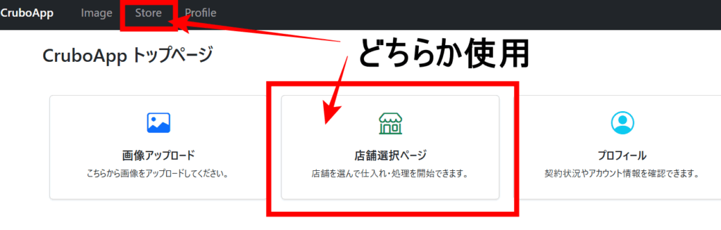 アップロードした画像の処理の結果を確認は、上部のStoreもしくはトップページの店舗選択ページより確認できます。