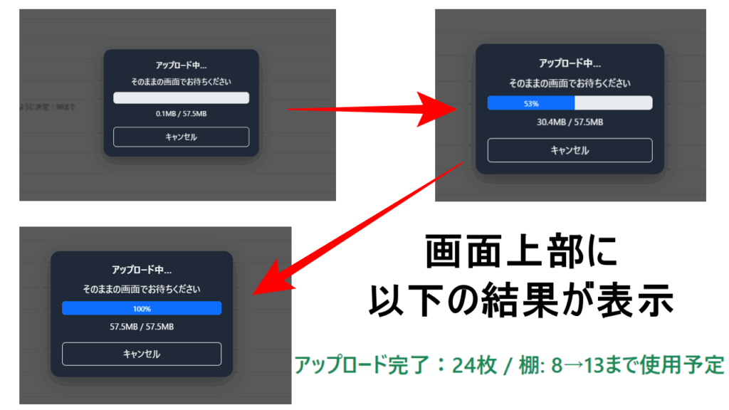 全ての情報を入れて『画像のアップロード』のボタンを押すと、アップロードが開始されます。