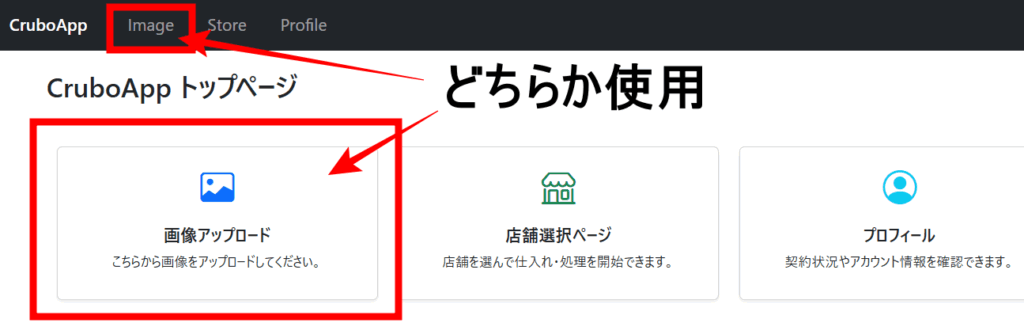 トップページある【画像のアップロード】または画面上部のメニューバーの【Image】より画像のアップロードぺージにいきます。