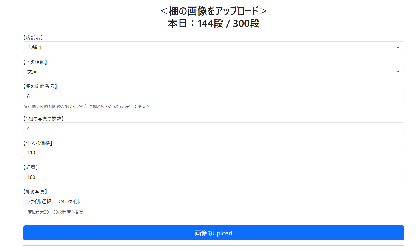 ・1棚の写真の枚数:棚ごとに何枚の写真を撮影したかを入力してください。